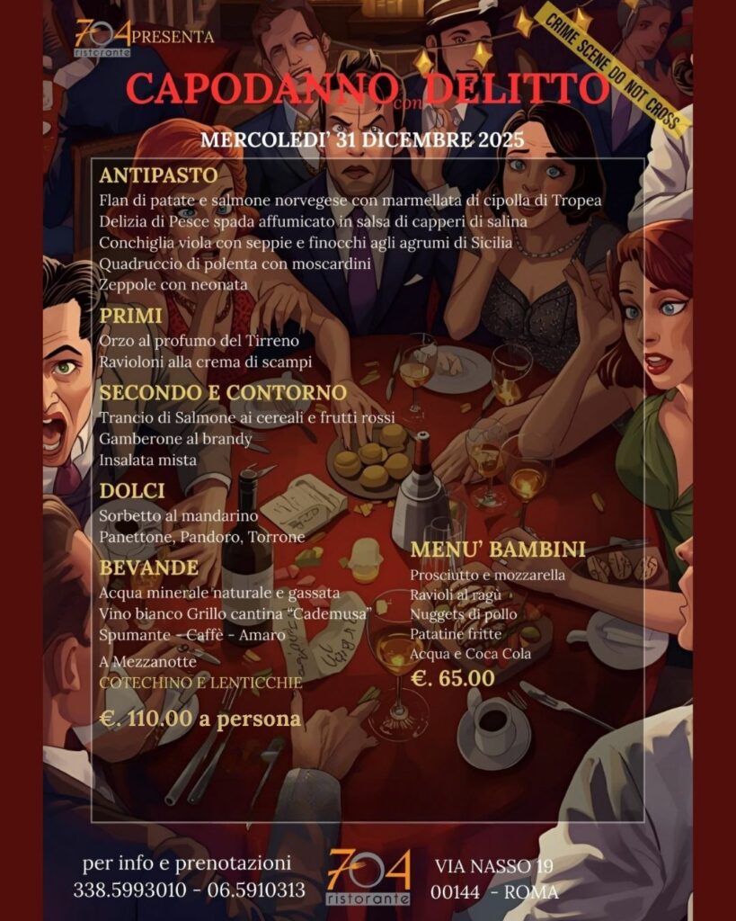 il 31 Dicembre 2025 il cenone di fine anno avrà un appuntamento con “la Cena con Delitto”: Una serata in cui, durante la cena, il pubblico prenderà parte alla scena del crimine e risolverà il giallo.